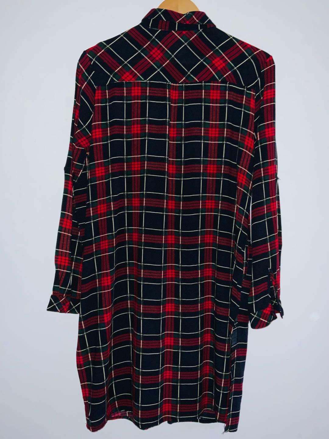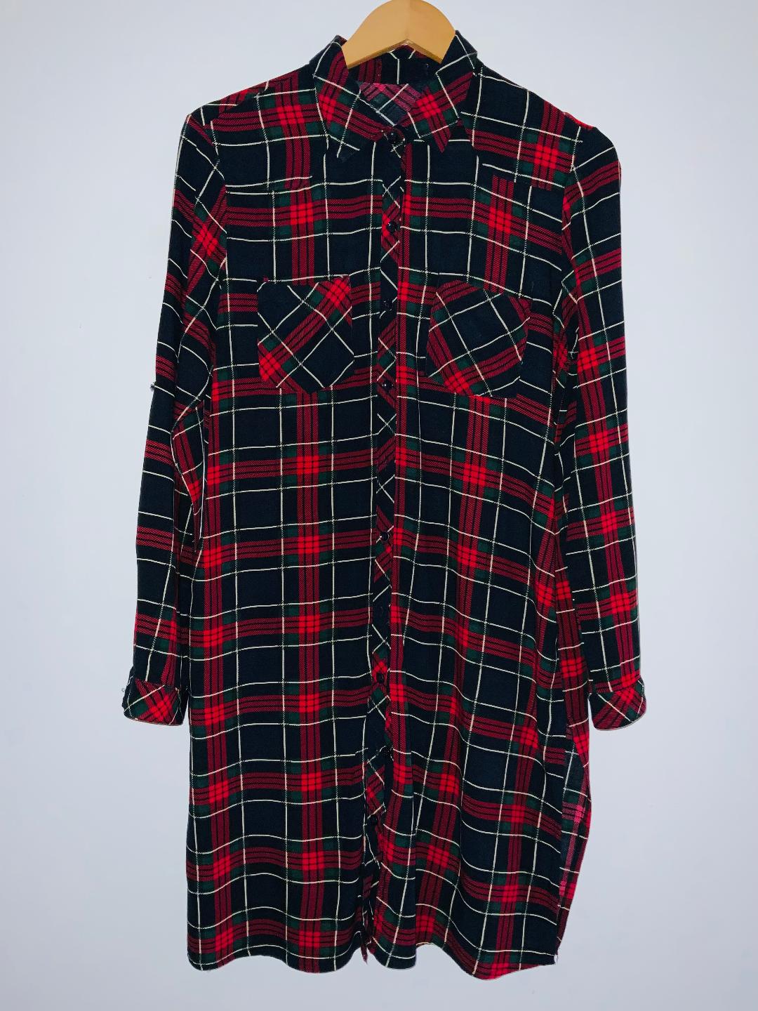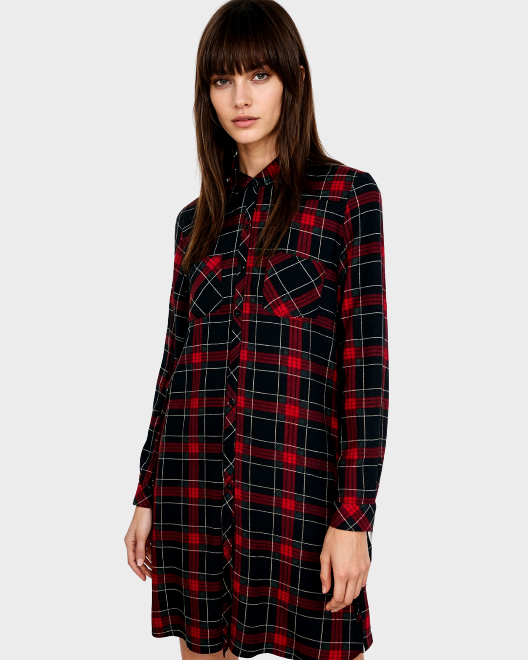 - Blusón confeccionado en tela plana con estampado de cuadros escoceses clásicos.