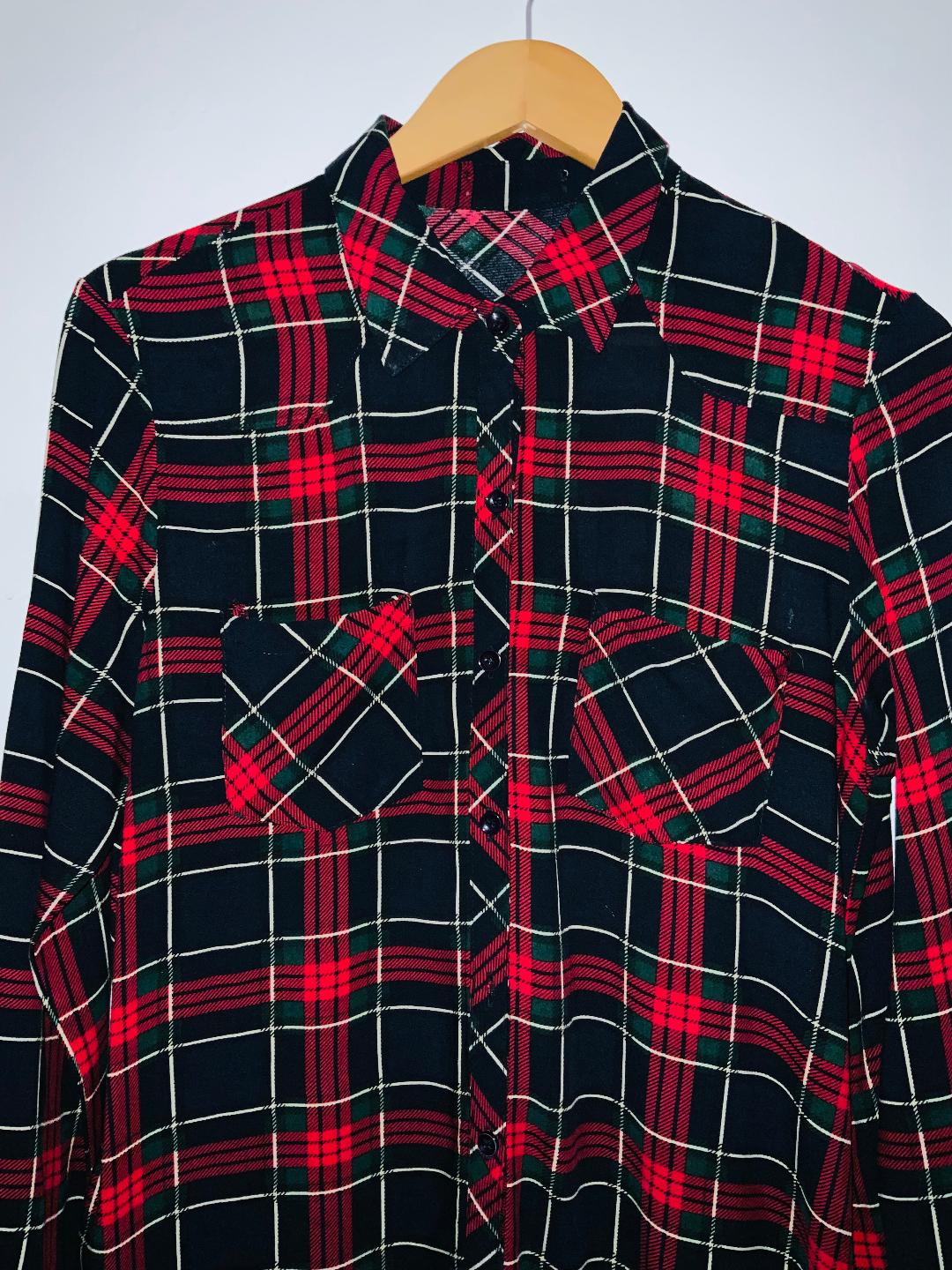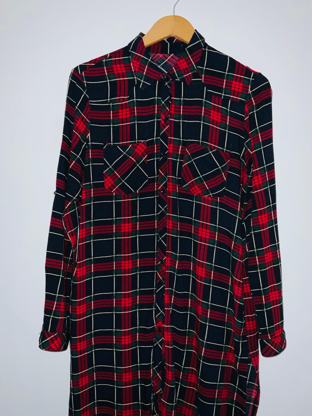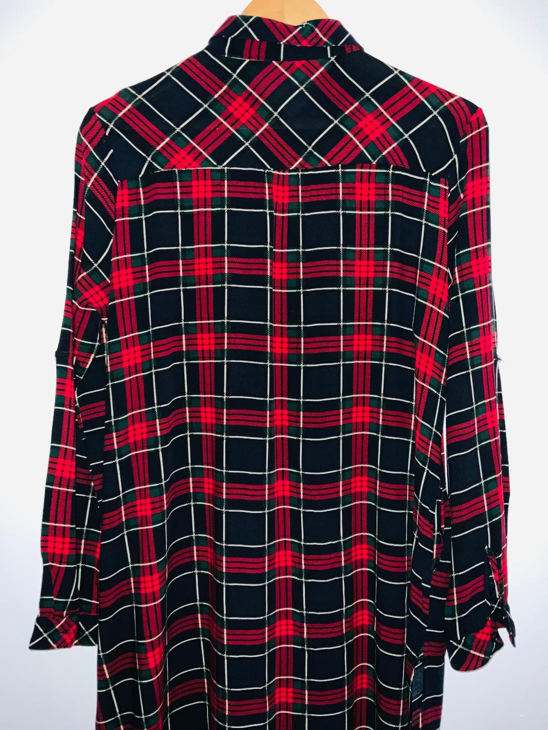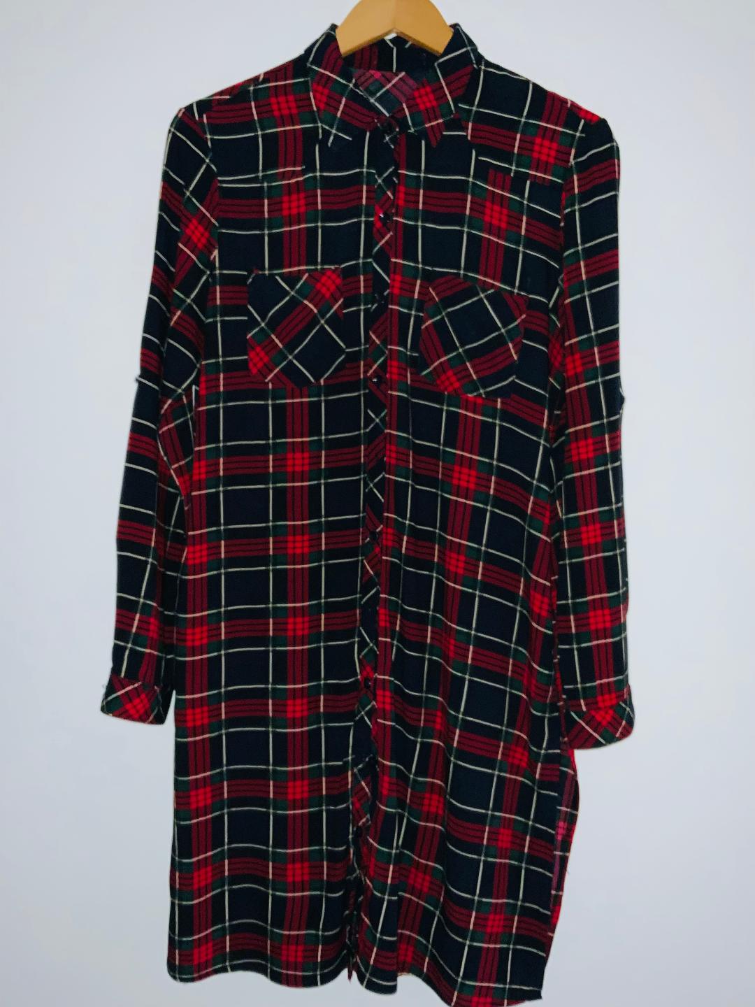 - Blusón confeccionado en tela plana con estampado de cuadros escoceses clásicos.