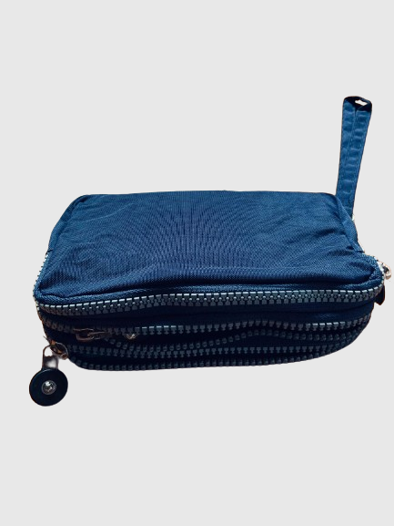 - Estuche en tela gruesa con tres compartimentos para organizar diferentes artículos