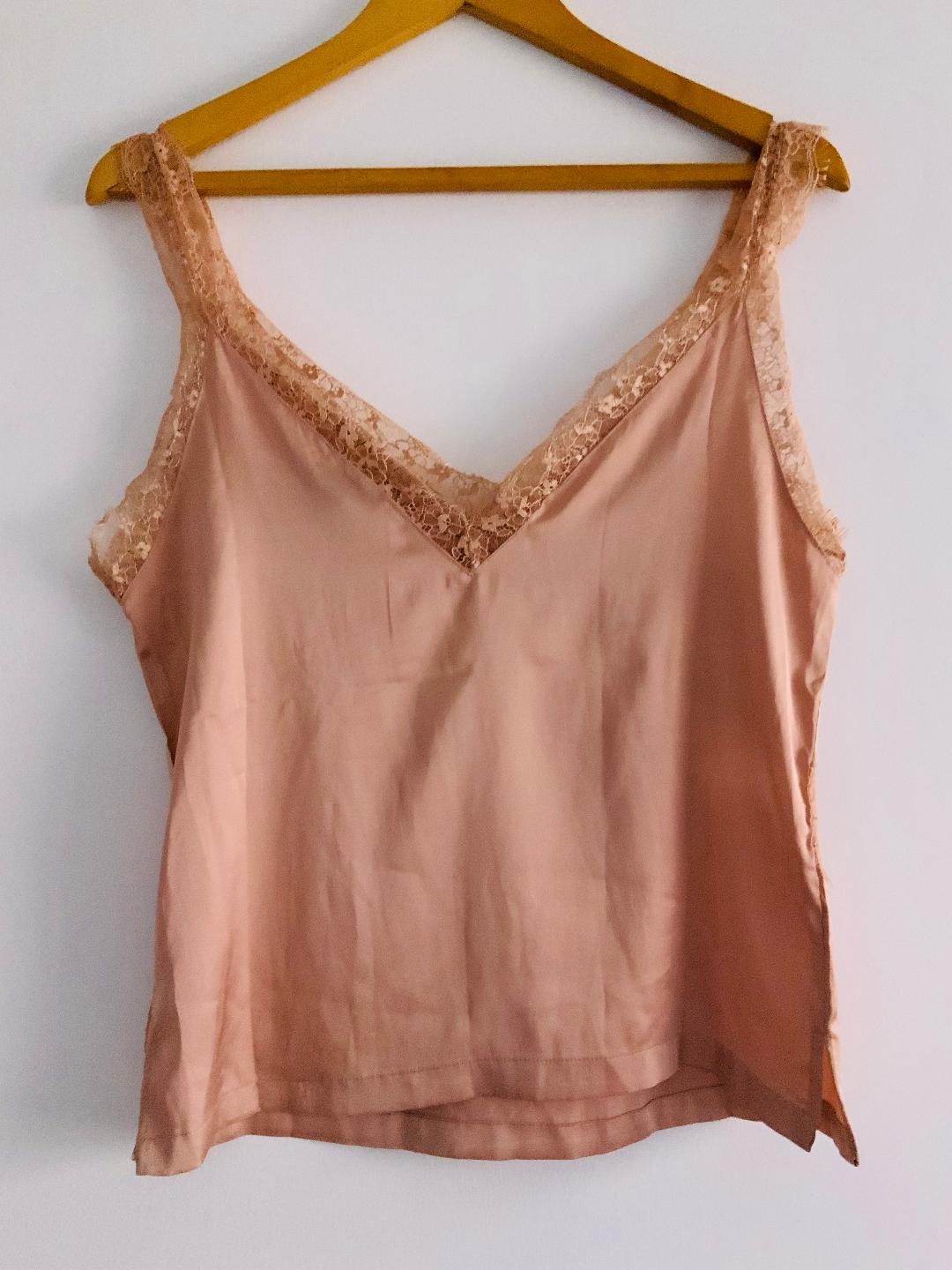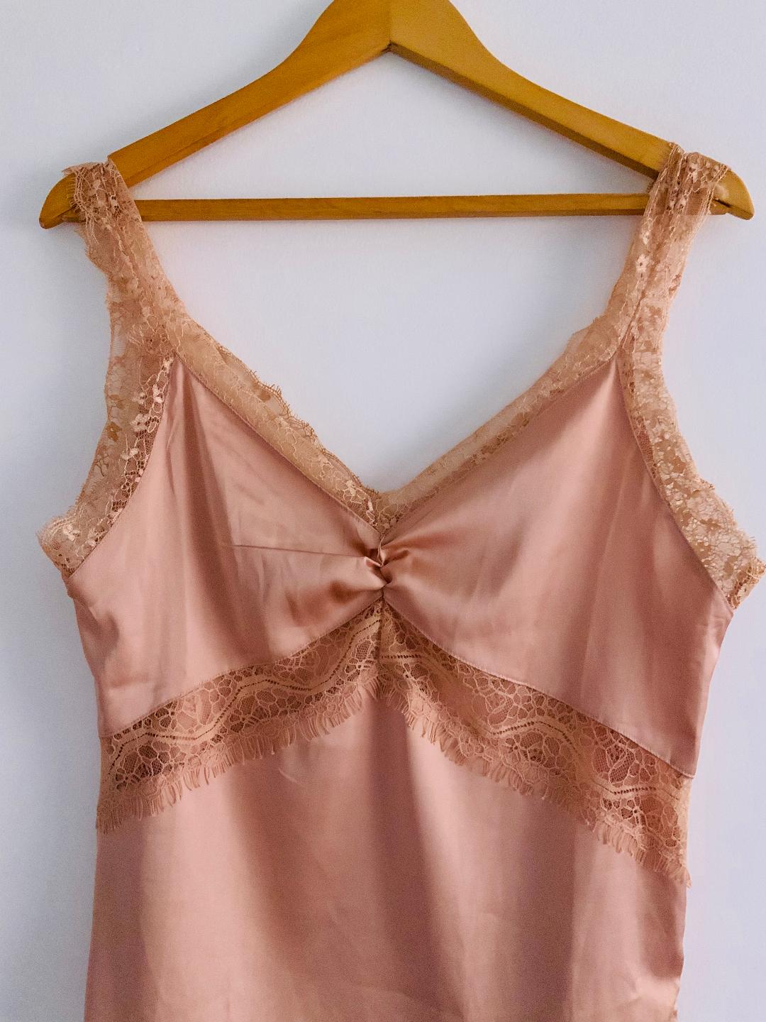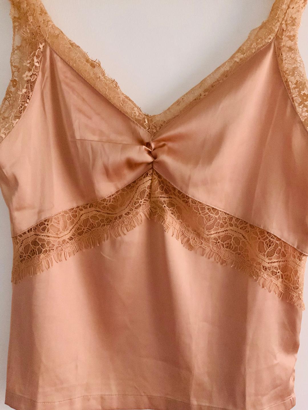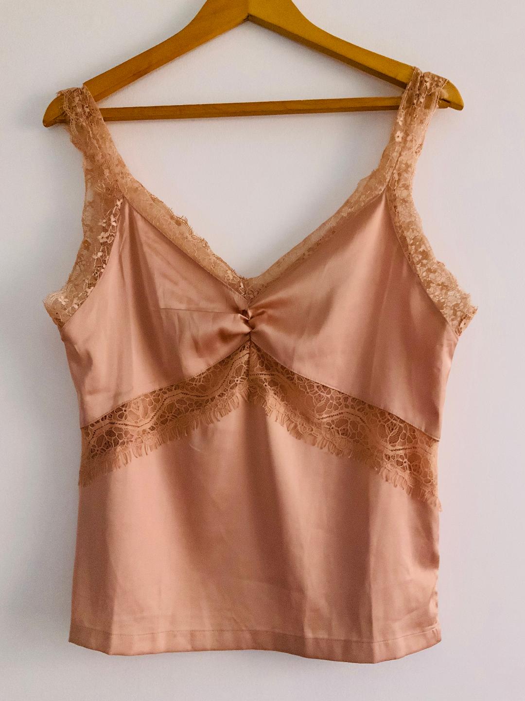 • Top lencero en satin cuello en pico con encaje a tono en tirantas y en corte delantero