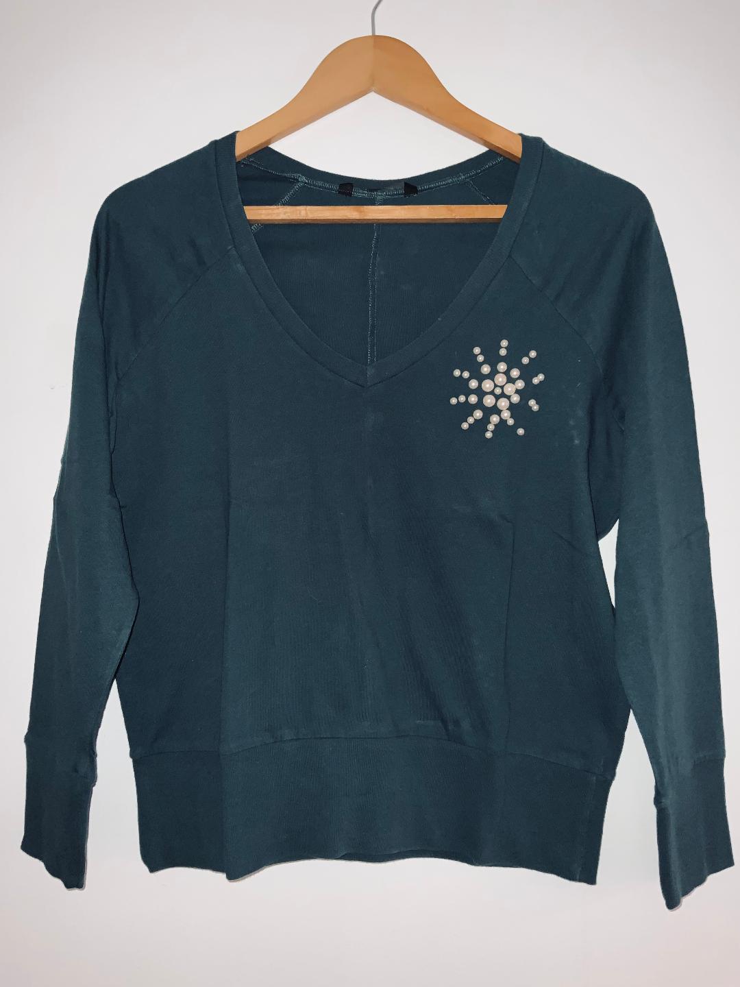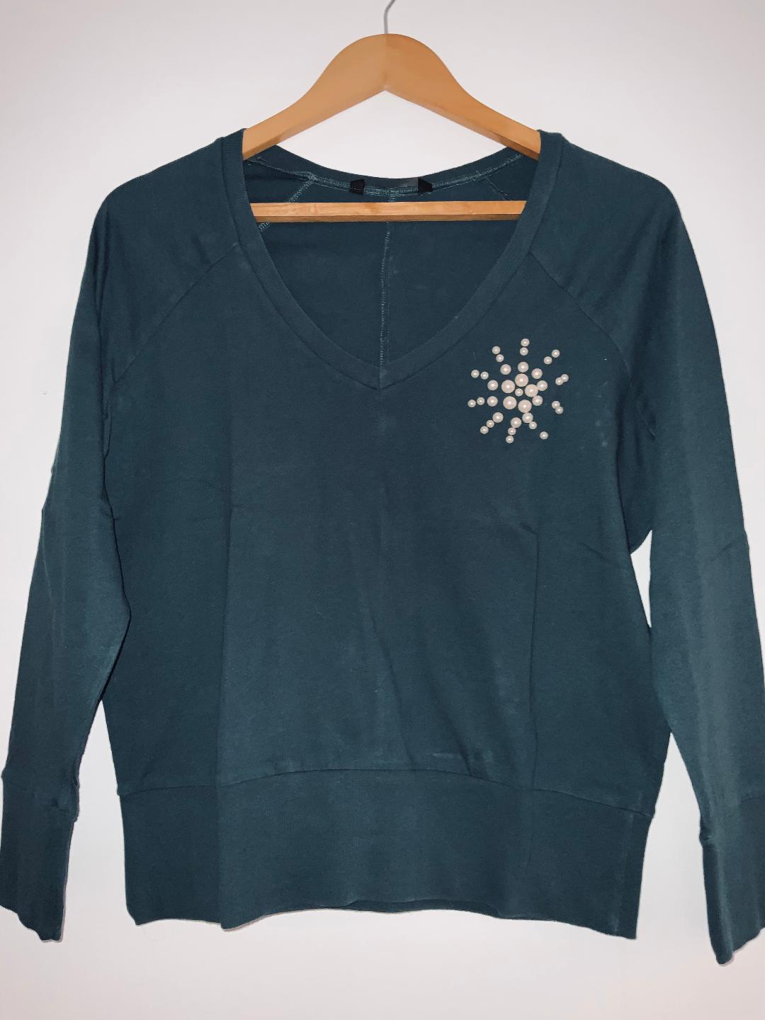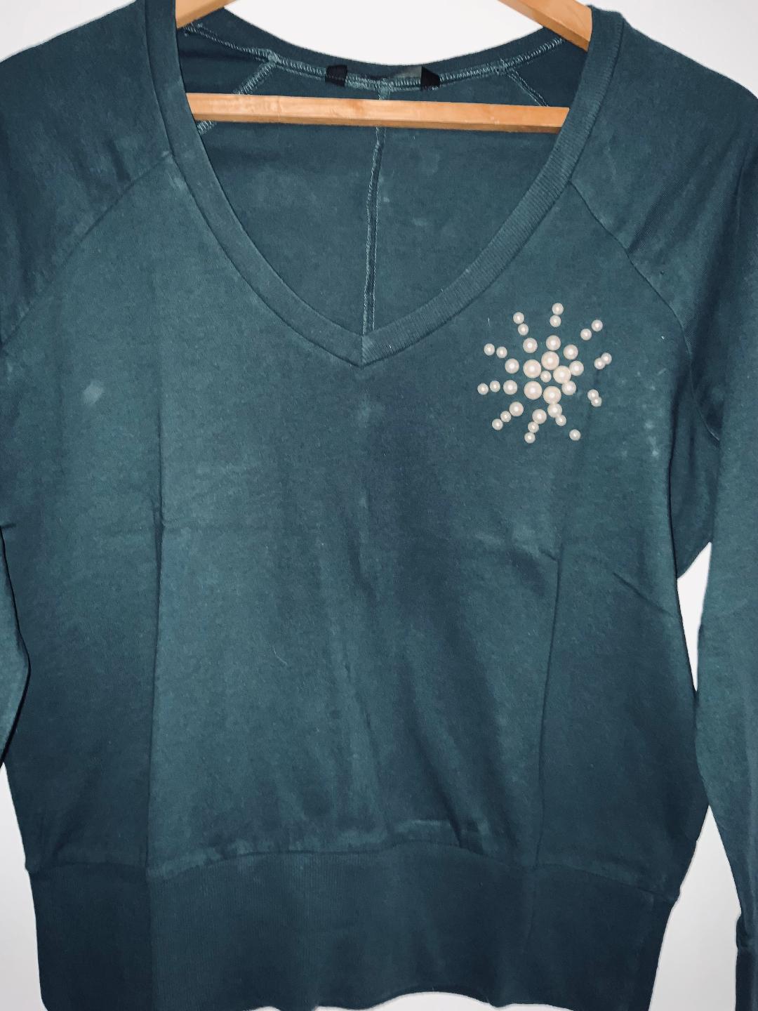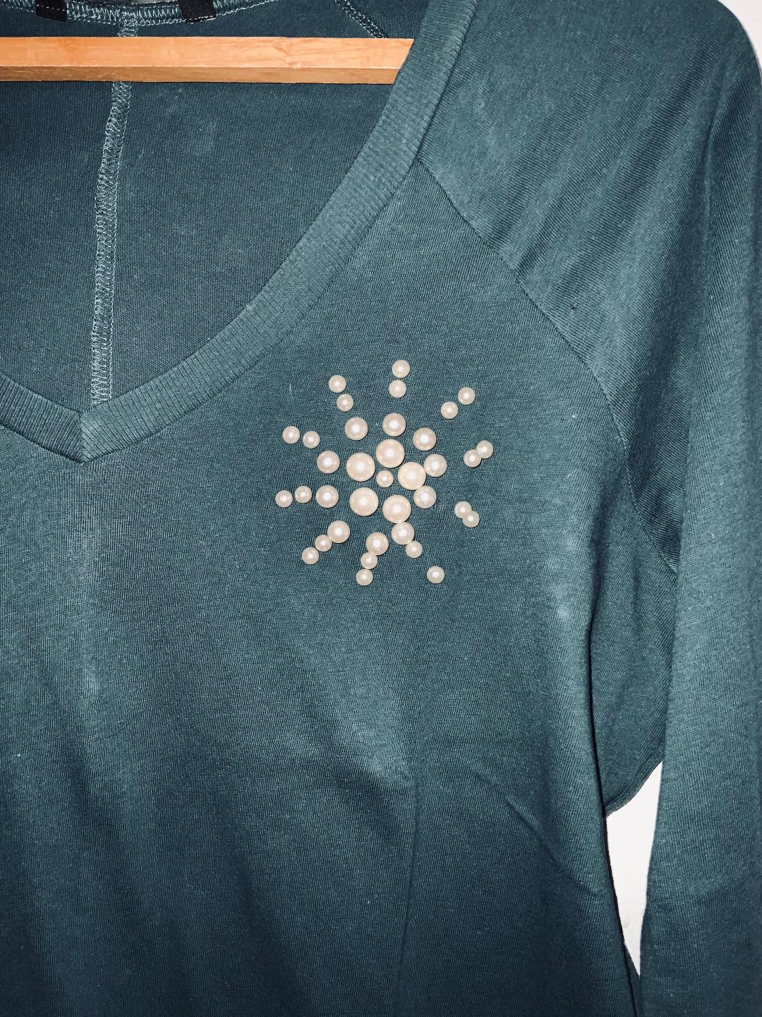 El diseño incorpora delicadas aplicaciones en perlas que añaden sofisticación y movimiento a la prenda