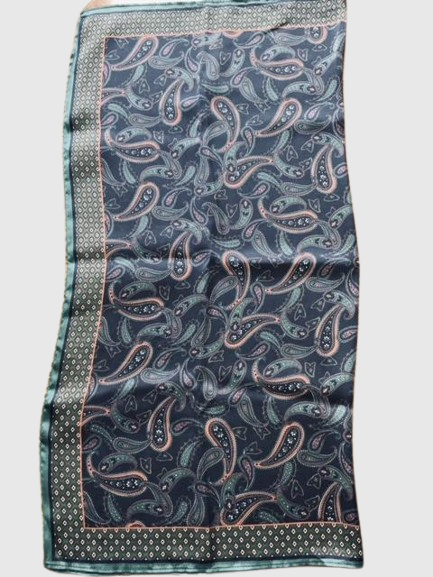 • Pañuelo cuadrado en tela plana tipo seda estampado de arabescos y cenefa