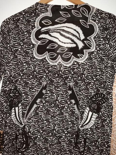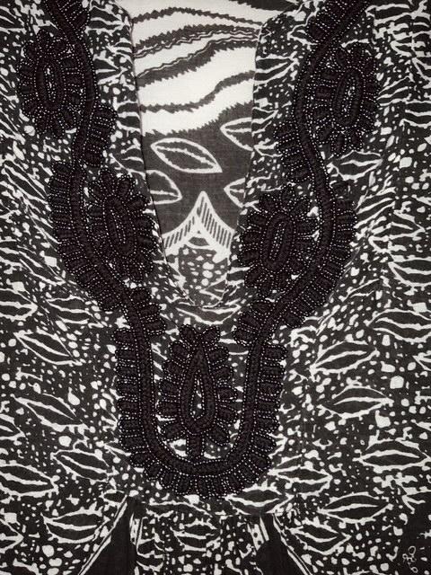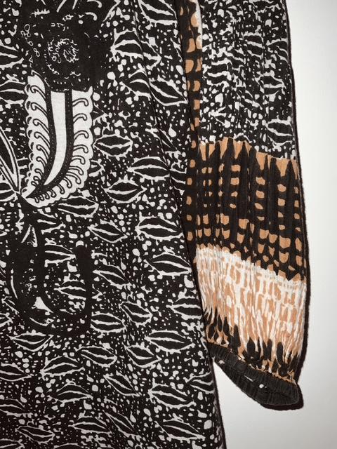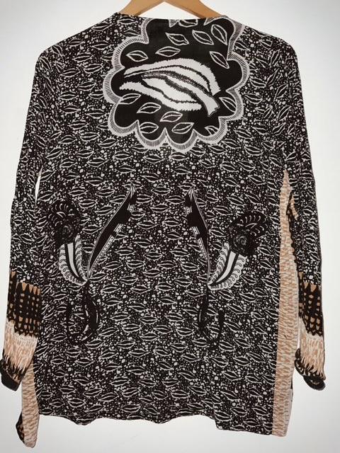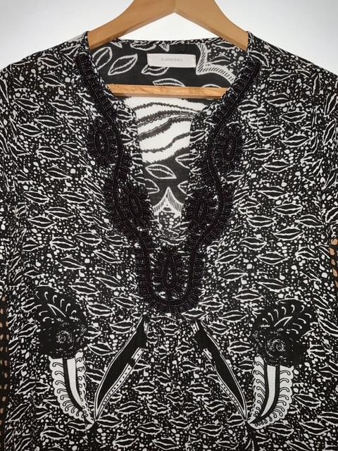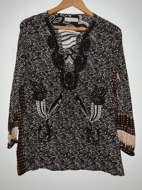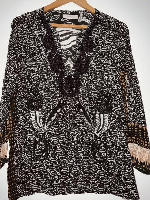 - Hermosa blusa en tela estampada con escote en V y aplicaciones en canutillo sobre el mismo