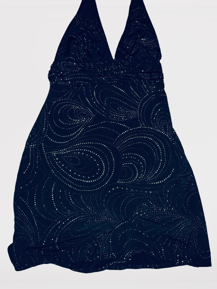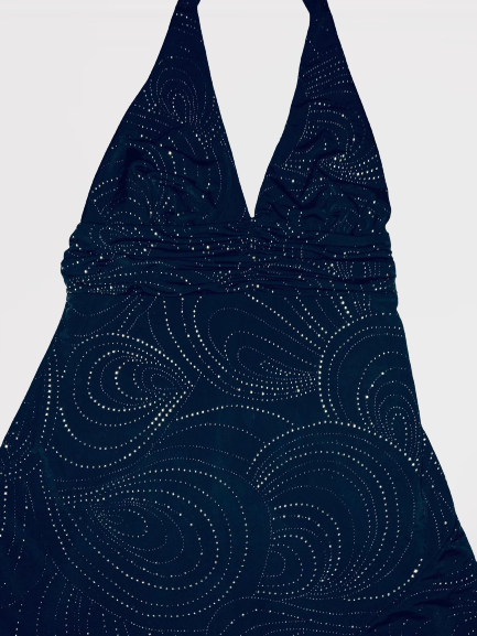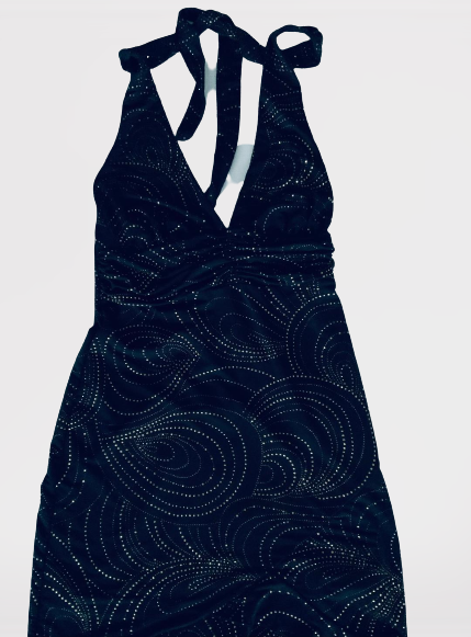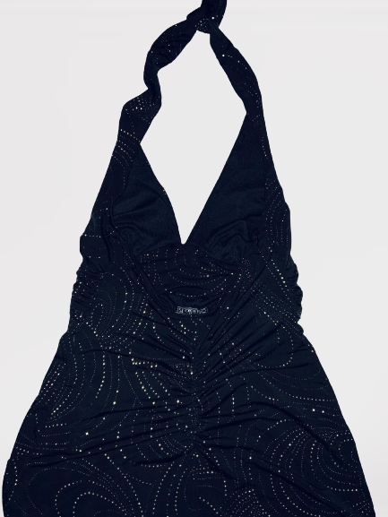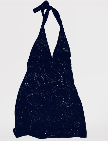- Escote en pico con tiras en la misma tela de amarrar en la parte de atrás