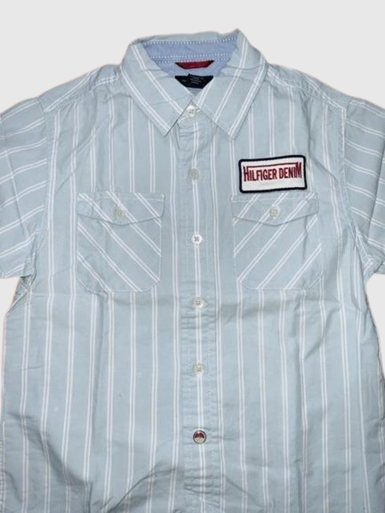 - Camisa en tela plana preteñida a rayas verticales en color azul claro